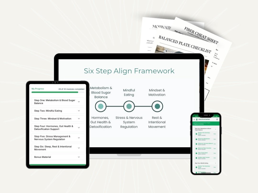 You’ll get lifetime access to my private course library, including 20+ video modules, expert guides, cheat sheets, and protocols. These resources are designed to give you the education and confidence to make informed, sustainable decisions about your health, even after our work together ends.